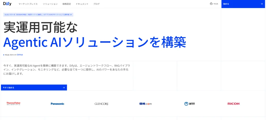 Dify(ディフィ、ディファイ)は、ユーザーが自分だけのAIエージェントやワークフローを構築できる次世代のAI開発プラットフォームです。オープンソースで公開されており(GitHubで10万以上のスターを獲得)、ノーコードながら高度なAI/ML機能を駆使したAIアプリ開発が可能な点が大きな魅力です。