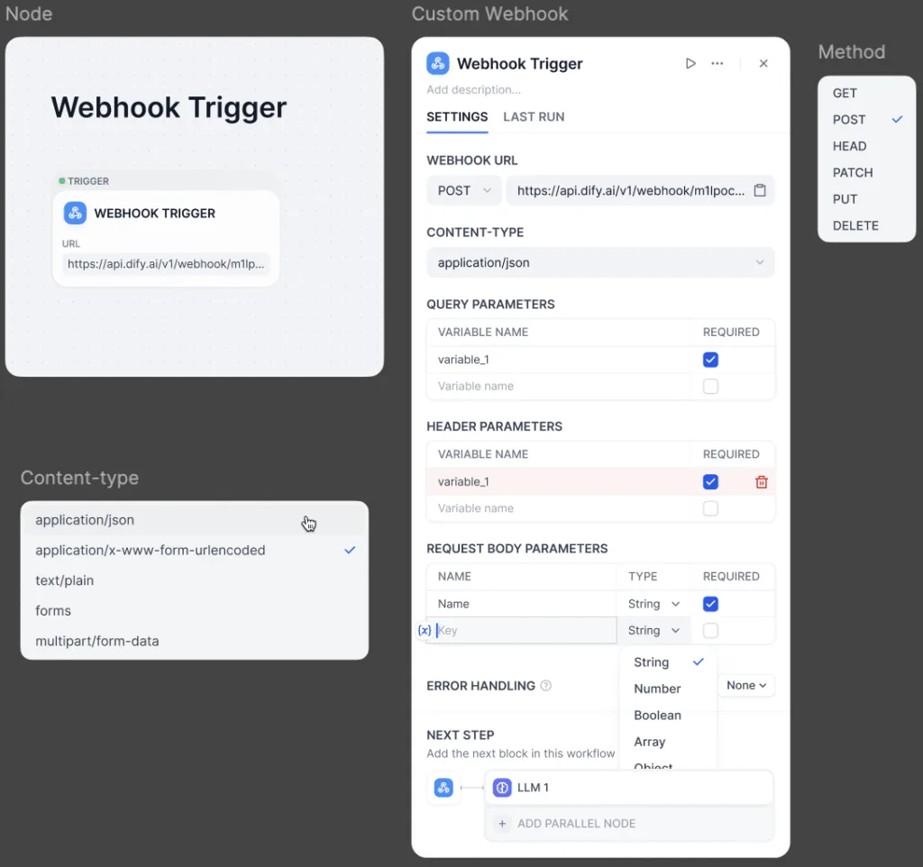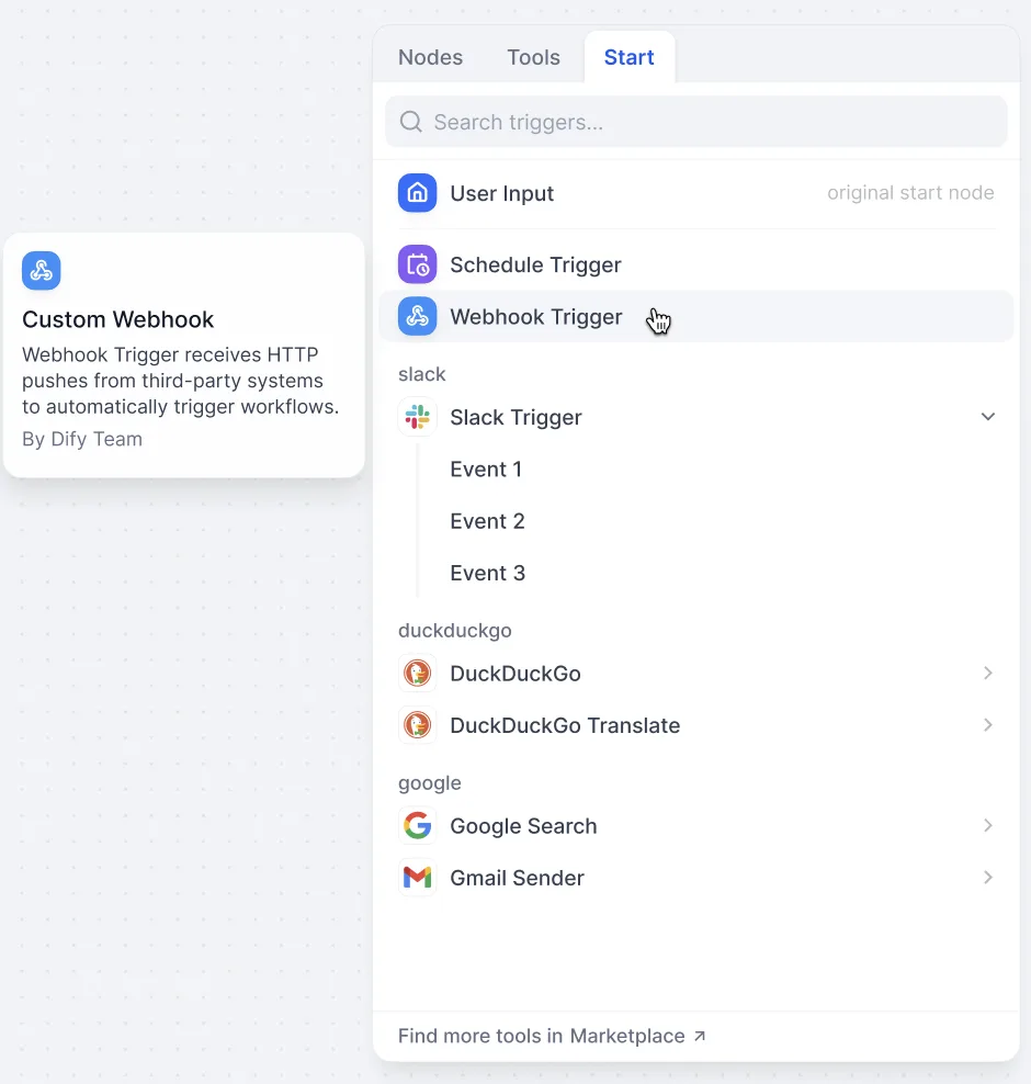 Difyでは従来、Canvas上の開始ノードから処理を手動で起動していましたが、トリガー導入後は開始ノード自体が上記イベント種別に紐づいた「トリガーノード」として機能します。各トリガーはそれぞれ入力パラメータ形式が異なり(Webhookなら自由なペイロード形式、プラグイン/SaaSならサービス固有の構造、スケジュールなら実行時刻のみ等)、ワークフロー開始時に受け取るデータ形式もトリガー種別ごとに最適化されています。