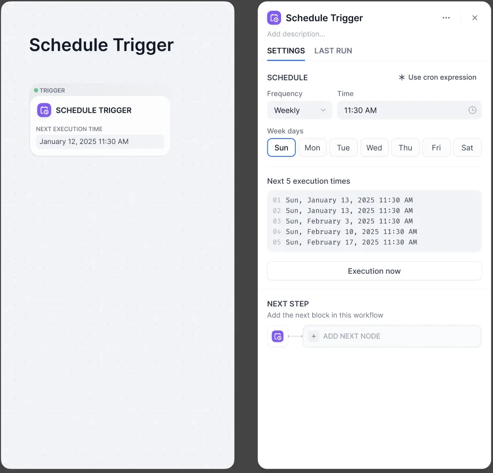 スケジュールトリガーの詳細設定として、月次トリガーの複数日選択やタイムゾーン対応などUI上で細かな指定ができるようになりました。特定の曜日を複数指定した毎週実行や、複数日付にまたがる月次実行など柔軟なスケジュールが組めます。UIの表記ゆれ修正やアイコン追加など、細部の改善も施されており、全体的に使い勝手が洗練されています。