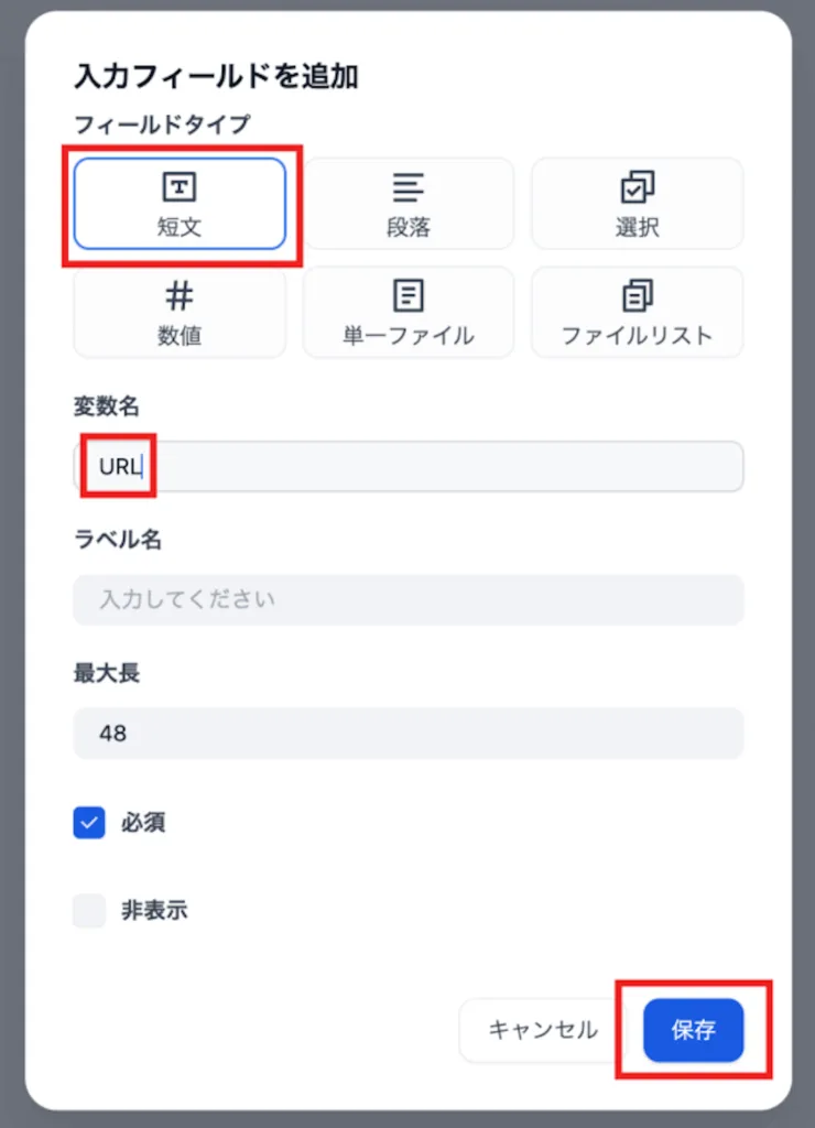 入力フィールドの設定画面でフィールドタイプを「短文」に選択して、変数名は「URL」と入力して、設定が終わったら、保存をクリックして下さい。
