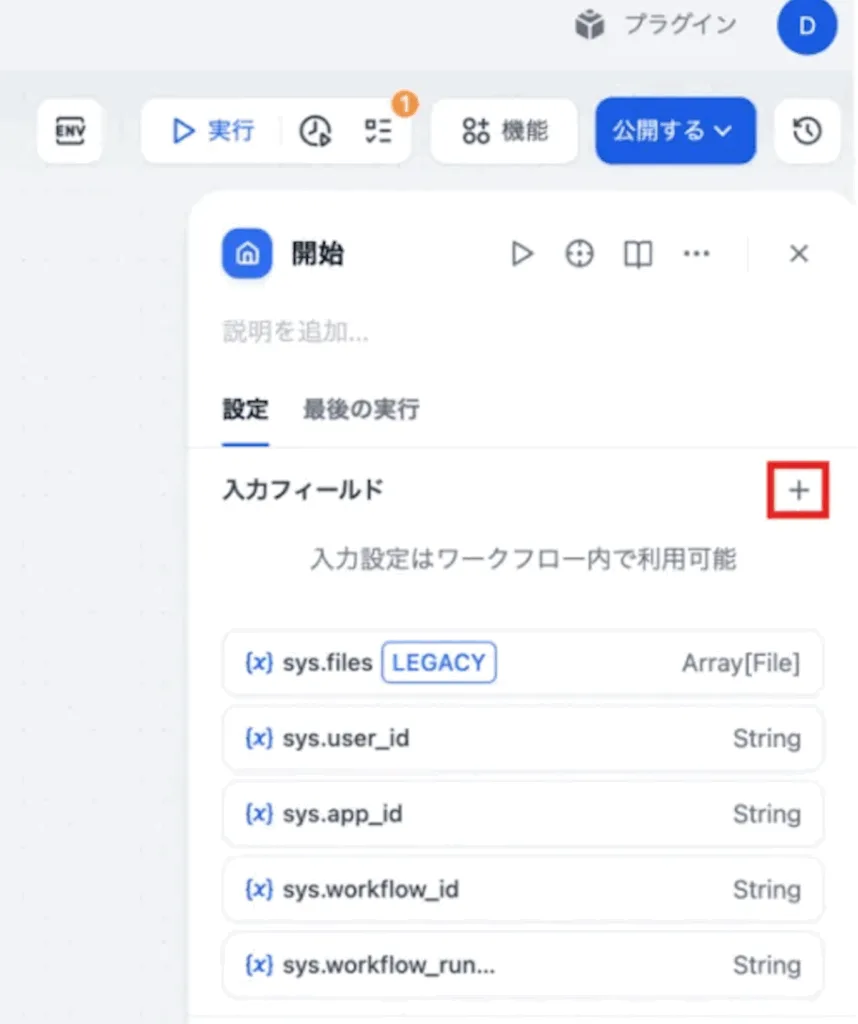 開始ブロックを選択した後に、設定画面の入力フィールドの右の「+」をクリックして下さい。