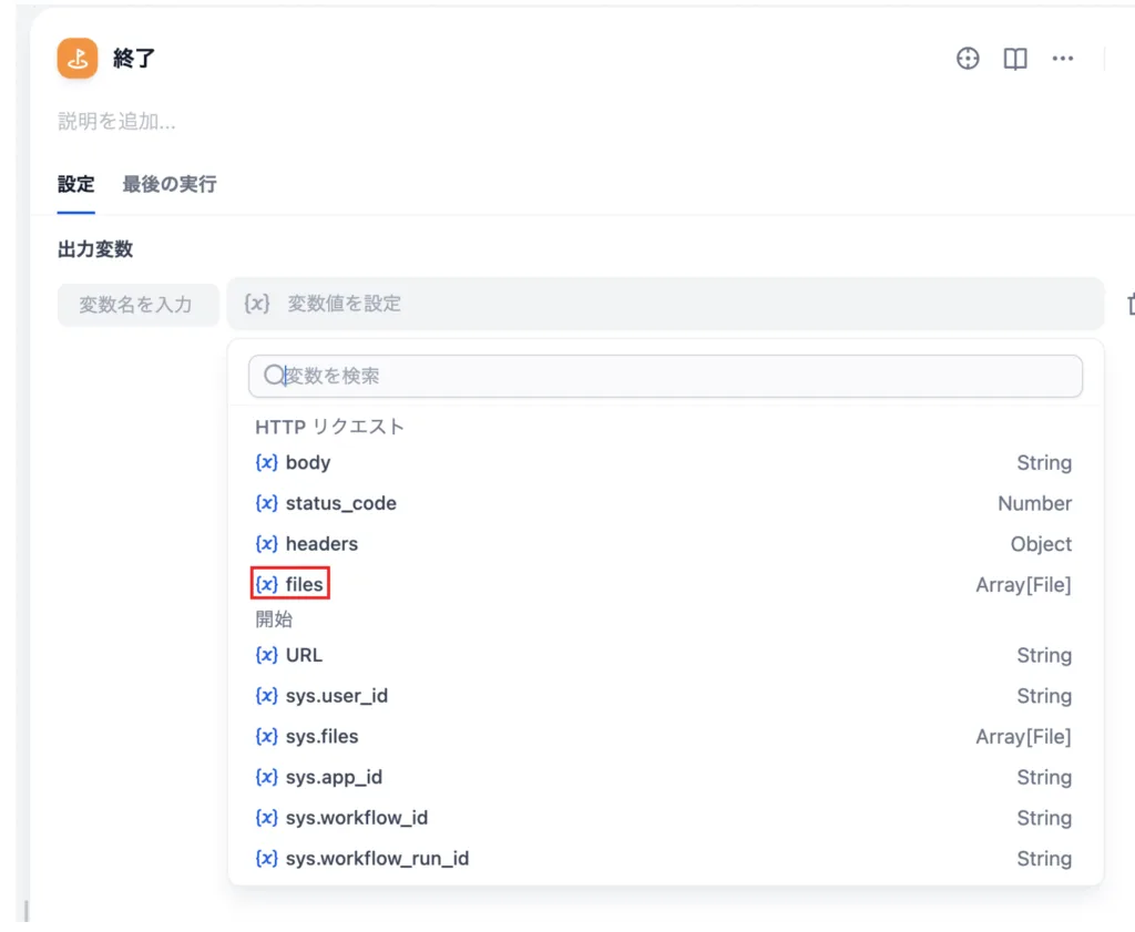 変数値の設定でHTTPリクエストの「files」を選択して下さい。