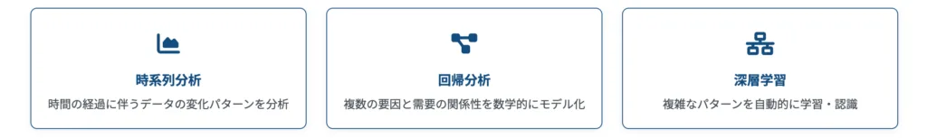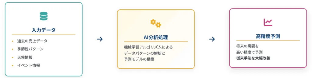需要予測AIは、過去の売上データ、季節性、天候、イベント情報などを機械学習アルゴリズムで分析し、将来の需要を高精度で予測します。