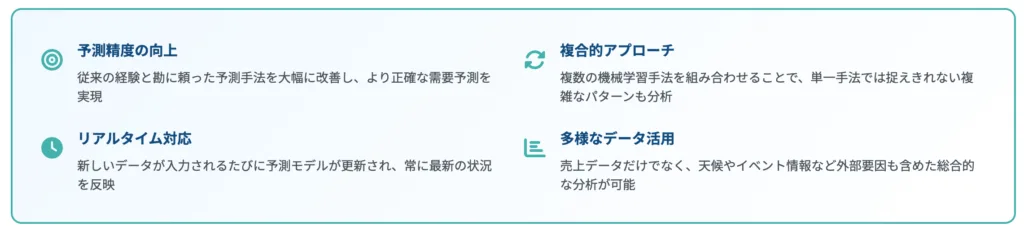 需要予測AIの導入により、過去データと外部要因を融合した複合的アプローチで市場変動を正確に捉え、予測精度の向上を実現します。さらに、新しい情報を即座に取り込みリアルタイム対応することで、在庫最適化や機会損失の低減を推進し、多様なデータ活用による戦略的意思決定を支援します。