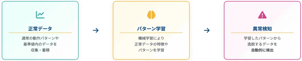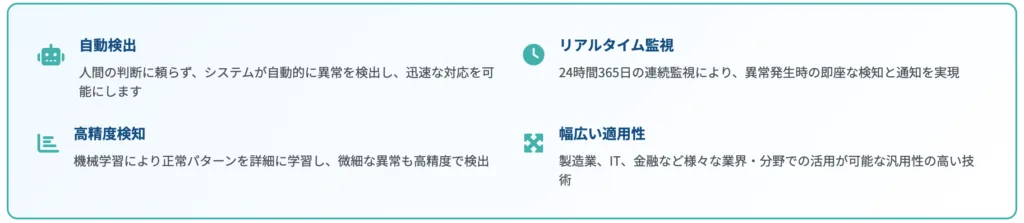 異常検知は、正常データのパターンを学習し、それから逸脱するデータを自動的に検出する技術です。製造業での設備故障予測、品質管理、セキュリティ監視など幅広い分野で活用されています。