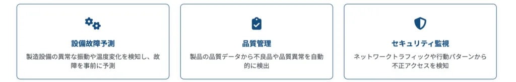 主要な活用分野として、設備の故障予測から製品の品質管理、IT インフラのセキュリティ監視まで、幅広い現場で活用することが出来ます。