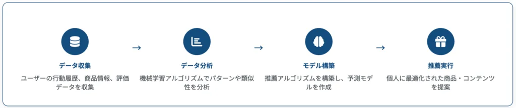 レコメンドシステムのワークフローは、①ユーザーデータの収集 → ②パターン分析 → ③モデル構築 → ④最適提案という4つのステップで、一人ひとりに最適な商品やコンテンツを提示します。
