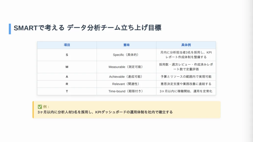 スキルや体制について議論する前に、絶対的に最初に行うべきステップは、データ分析チームが「なぜ」必要なのかを定義することです。「データ活用が必要だ」といった曖昧な目標は、失敗への近道です。目的は、具体的(Specific)、測定可能(Measurable)、達成可能(Achievable)、関連性がある(Relevant)、期限付き(Time-bound)のSMART原則に則って、設定する事をおすすめしています。