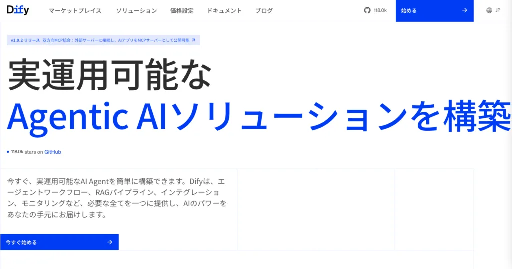 DifyはChatGPTやClaudeなど複数のLLM(大規模言語モデル)を用いたAIアプリをプログラミング不要で構築できるオープンソースの次世代AI開発プラットフォームです。社内チャットボットやFAQシステム、社内データを活用した検索ツールなどエンジニアでなくとも簡単に作成できる点が特徴で、急速にコミュニティの支持を集めています(2025年6月にはGitHubスター数10万を突破し、記事執筆時点で約118kに達しています)。