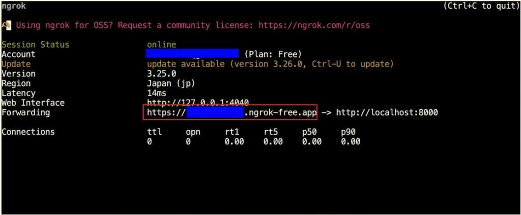 https://XXXXXXXX.ngrok-free.appのようなURLが発行されるので、これがあなたのAPIの外部アクセス用エンドポイントになります。