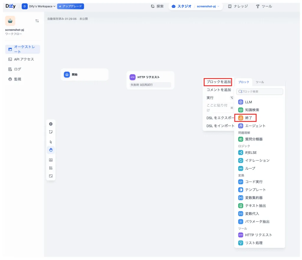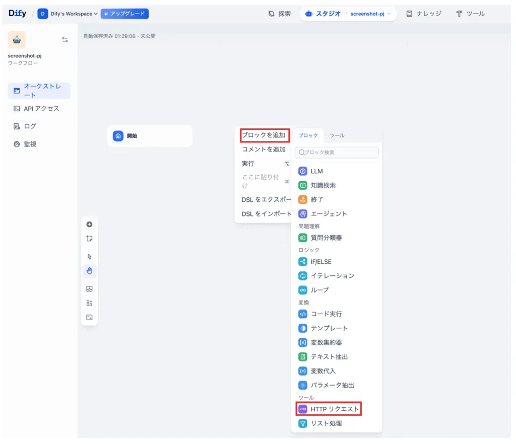 DifyのワークフローからそのAPIを呼び出し、スクリーンショットを取得・出力