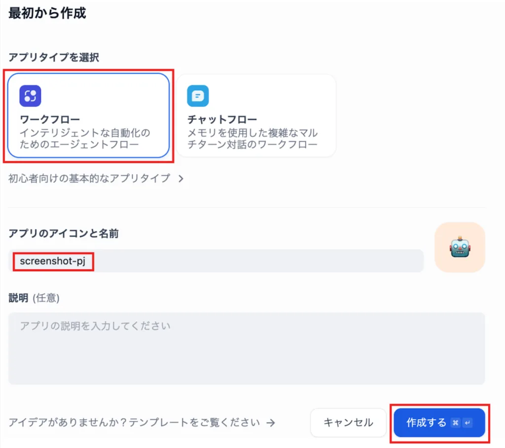設定画面に移るので、アプリタイプは「ワークフロー」を選択して、アプリ名を入力した後に、「作成する」をクリックして下さい。