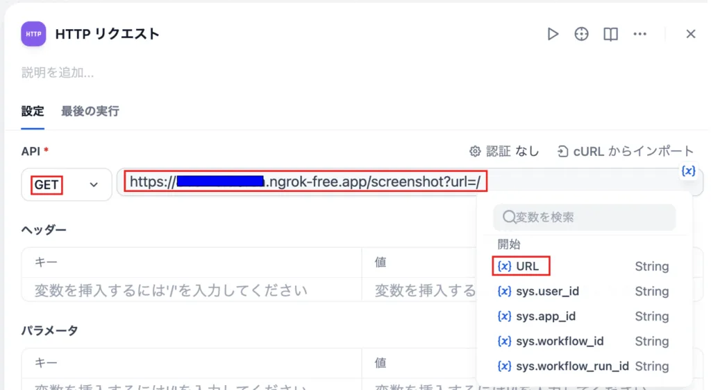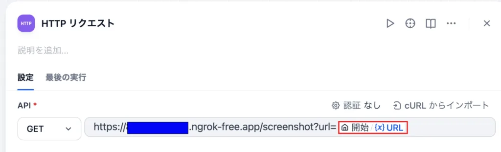APIエンドポイントは「3. ngrokを利用してローカルAPIを外部からアクセス可能にする」のstep3で取得したエンドポイントにパラメータ(/screenshot?url=)を付け加えて、さらに”url=“の後に”/“を入力すると、変数のリストが表示されるので「URL」を選択して下さい。