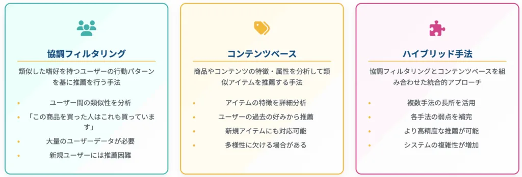 有名な手法としては、協調フィルタリング、コンテンツベースフィルタリング、ハイブリッド手法などのアプローチがあります。